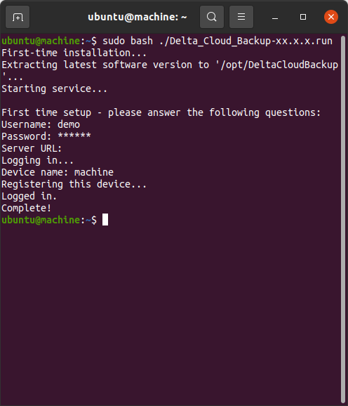 sudo bash ./Delta_Cloud_Backup-xx.x.x.run, replacingxx.x.xwith the current version you have downloaded, then click the Next button. - In the next window you will see access credentials that will be required during the installation and will be needed to complete it. Copy them one by one and enter them when the script asks for them: