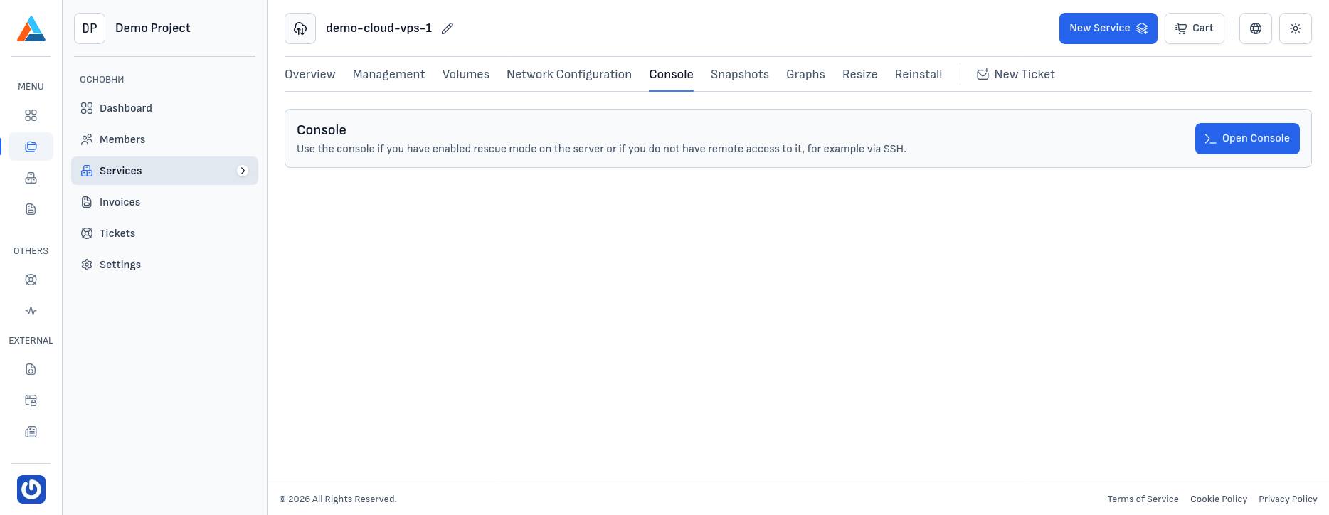 The "Console" section provides a built-in web console that gives you direct access to your server from the browser, without needing an SSH client. The console is useful in situations where: