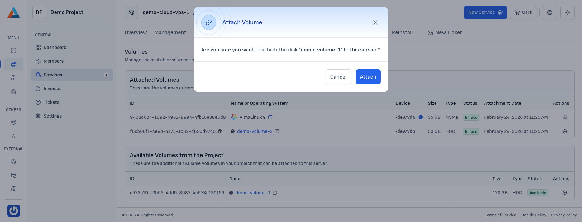 To attach an available volume from your project to the server, follow these steps:
