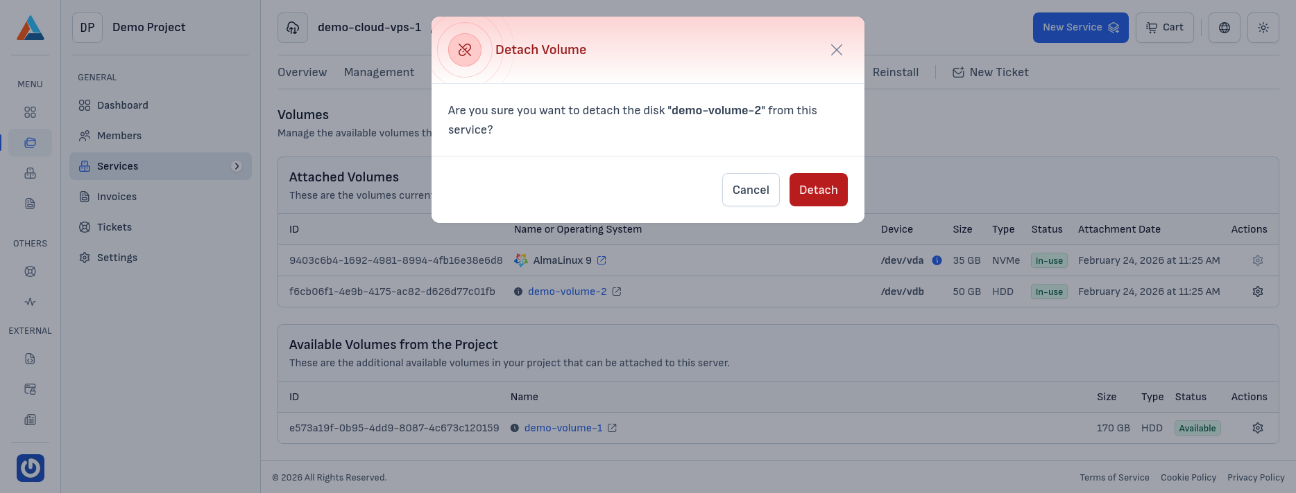 In the "Attached Volumes" section, find the volume you want to detach and click the "Detach Volume" button in the "Actions" column to open the confirmation dialog.