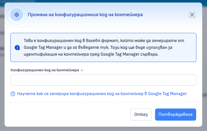 A window will open where you need to enter the Container Configuration Code — this is a string in Base64 format ** that is generated in Google Tag Manager**.