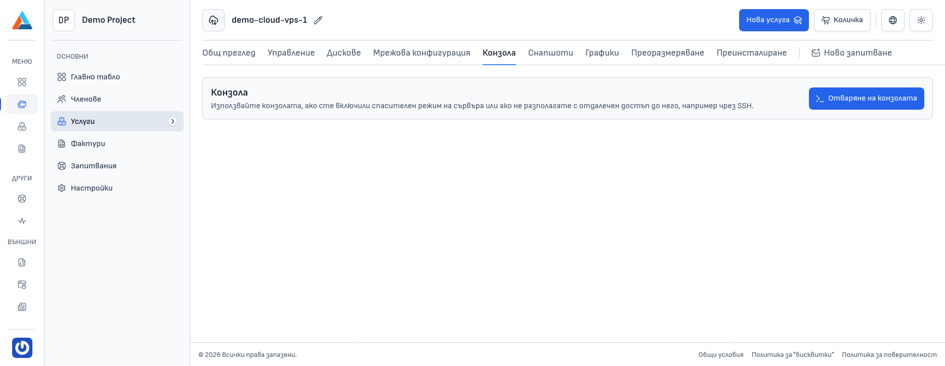 Разделът "Конзола" предоставя вградена уеб конзола, чрез която можете да получите директен достъп до Вашия сървър от браузъра, без да е необходим SSH клиент. Конзолата е полезна в ситуации, когато: