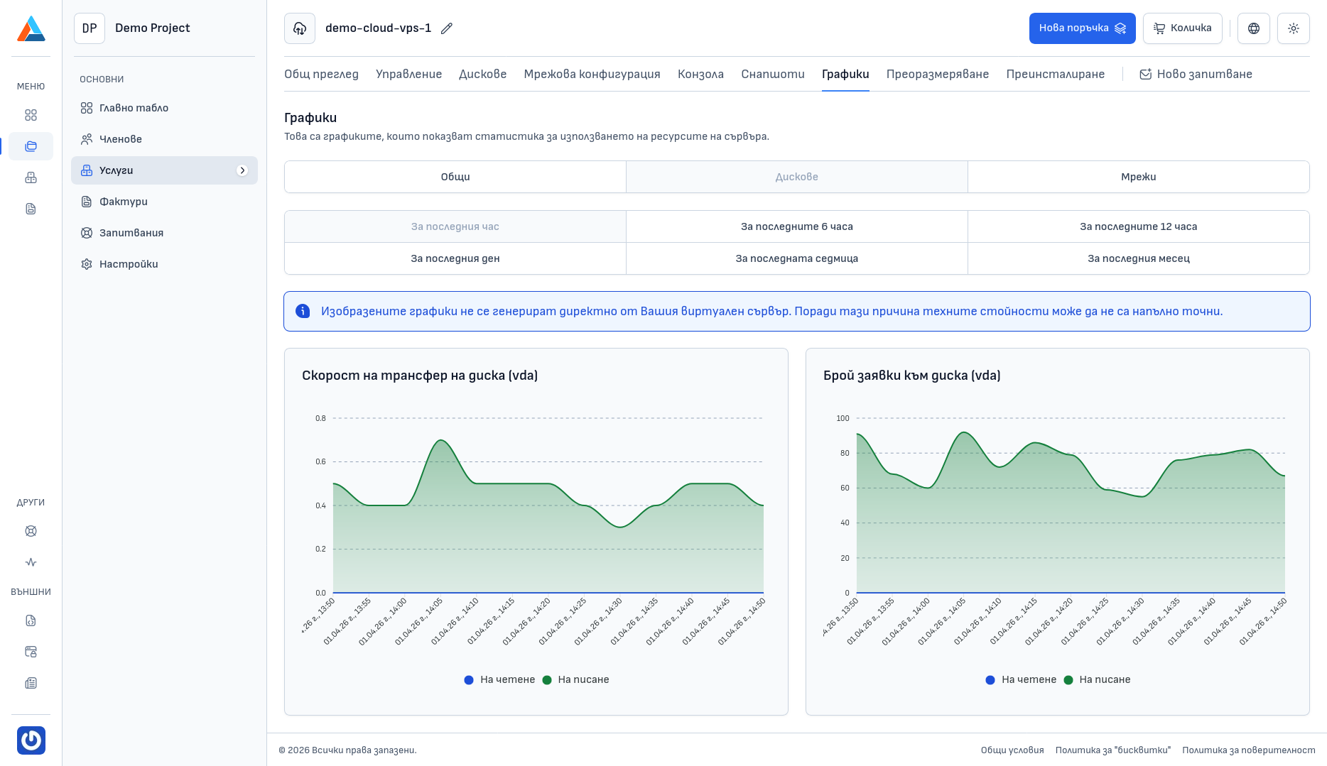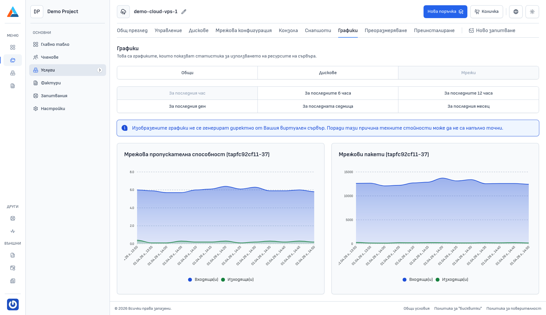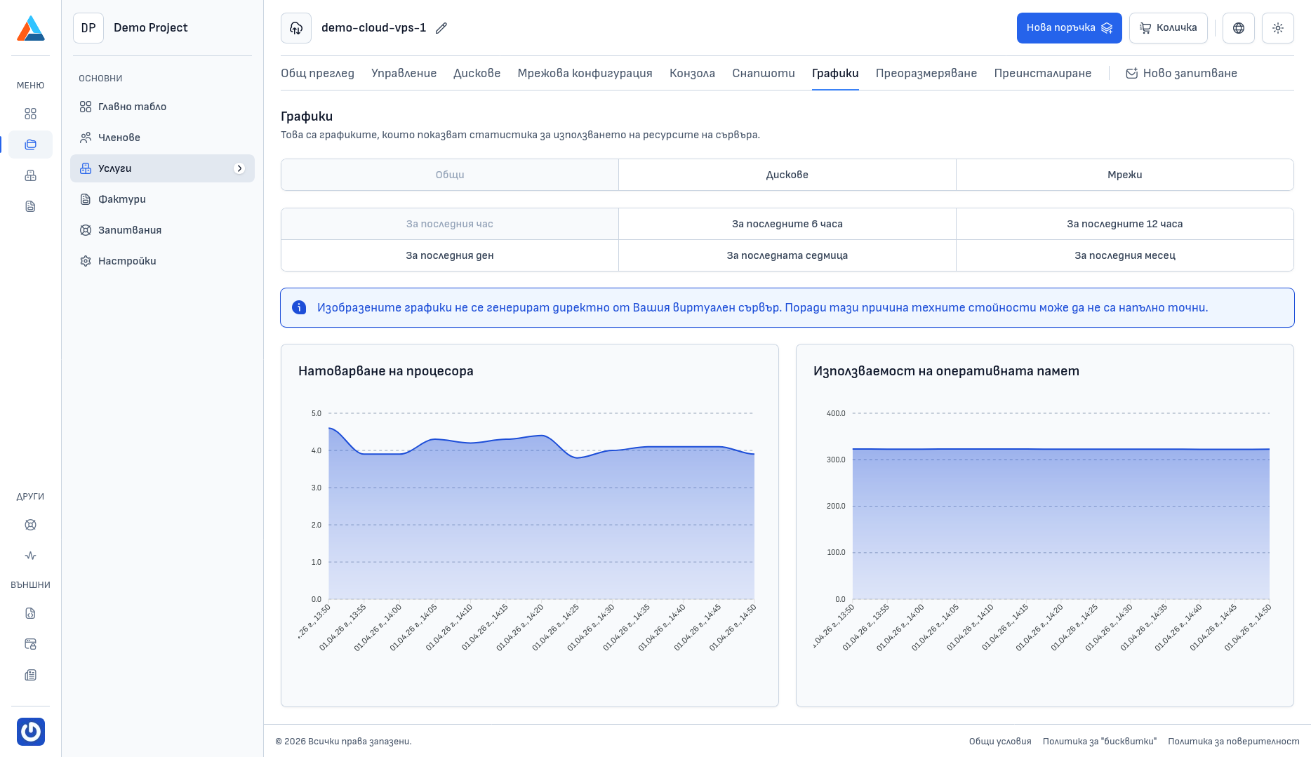 Изобразените графики не се извличат директно от Вашия виртуален сървър. Поради тази причина показаните стойности може да не са напълно точни.