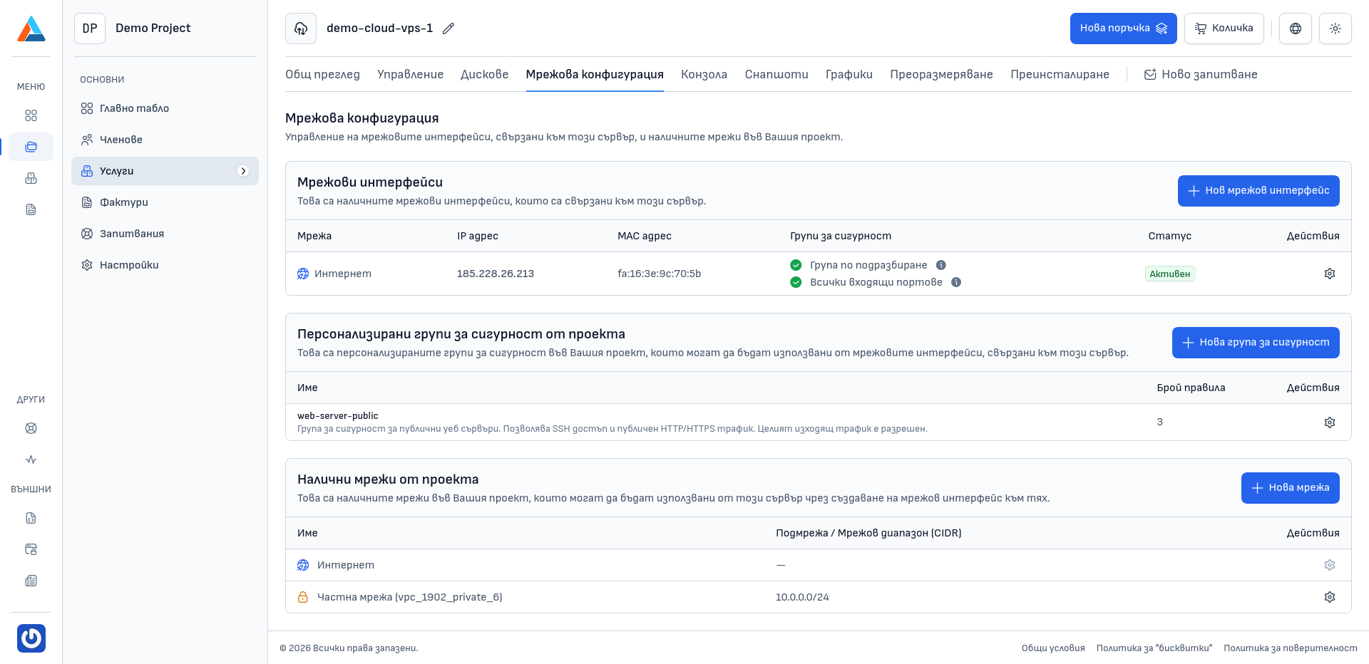 Разделът "Мрежова конфигурация" в страницата на Вашия Cloud VPS сървър предоставя пълен контрол над мрежовата среда. Тук можете да управлявате мрежовите интерфейси, да създавате частни мрежи и да конфигурирате групи за сигурност с детайлни правила за трафик.