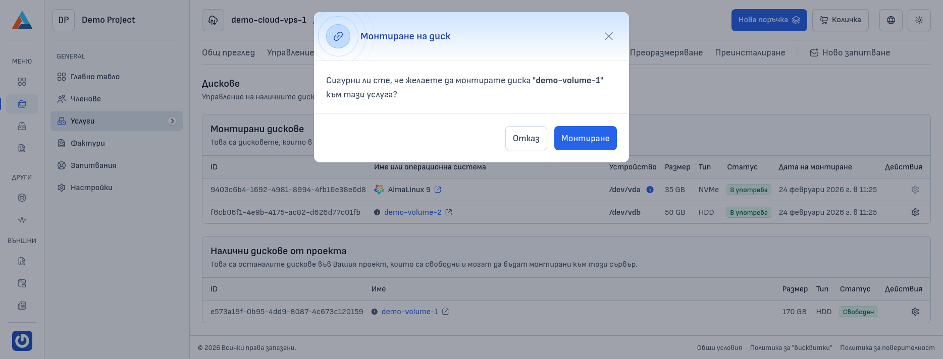 В секцията "Налични дискове от проекта" намерете диска, който искате да монтирате, и натиснете бутона "Монтиране на диска" в колоната "Действия", за да се отвори диалогов прозорец за потвърждение.