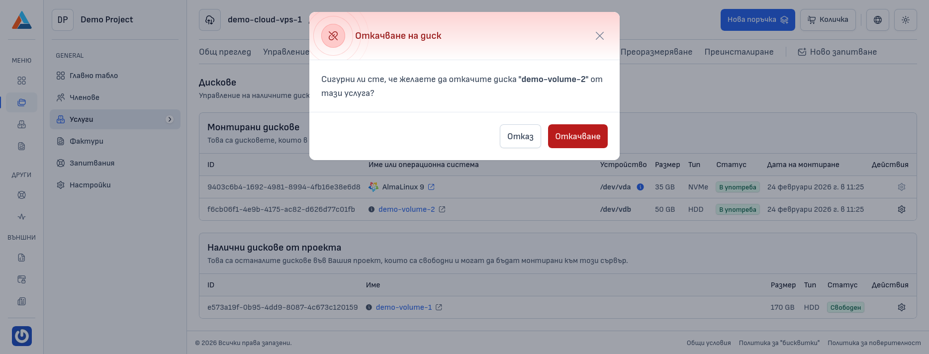 В секцията "Монтирани дискове" намерете диска, който искате да демонтирате, и натиснете бутона "Откачване на диска" в колоната "Действия", за да се отвори диалогов прозорец за потвърждение.
